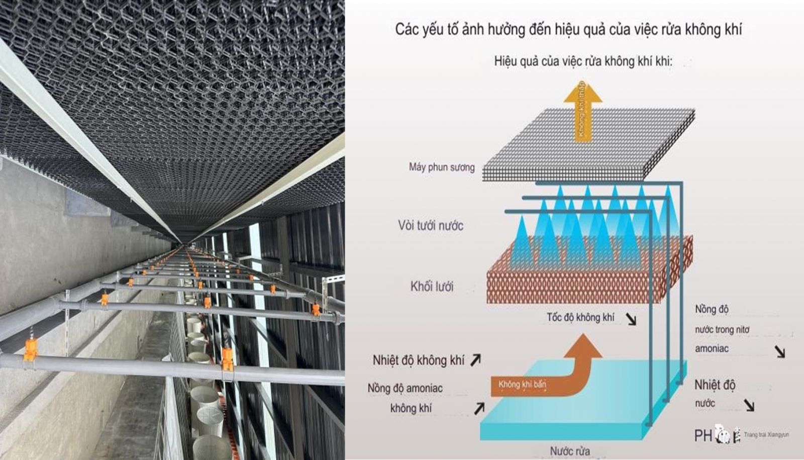 Không khí ô nhiễm được dẫn từ khu vực chăn nuôi qua lưới lọc dạng module, tại đây nó được rửa sạch liên tục bằng dòng nước phun áp lực thấp. Các vòi phun và đường ống được thiết kế tối ưu để đảm bảo phân bố nước đều khắp bề mặt lưới, vừa tăng diện tích tiếp xúc, vừa duy trì hiệu quả làm sạch cao. Ngoài ra, khối lưới còn đóng vai trò phân tán dòng nước thành các giọt mịn, giúp hạn chế thất thoát nước và ngăn chặn hiệu quả việc phát tán giọt mang chất ô nhiễm ra môi trường.