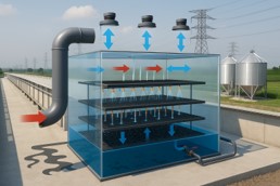 Hệ thống khử mùi trong trại chăn nuôi vận hành trên nguyên lý kết hợp giữa xử lý vật lý và xử lý sinh học, thông qua dòng nước tuần hoàn và hệ vi sinh vật cư trú trong các khối lưới lọc chuyên dụng. Khi luồng không khí ô nhiễm – chứa các hợp chất bay hơi như amoniac (NH₃), hydro sulfide (H₂S) và bụi mịn – được dẫn qua hệ thống, quá trình lọc diễn ra theo nhiều tầng tương tác.